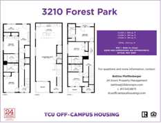 TCU housing at its best. There are 5 generous private bedrooms, each with a private bathroom and private coded door lock. The common floor features solid surface floors, a balcony, large open living area with flat screen TV, powder bath, and a kitchen your parents will envy. There are 2 bedrooms on the 1st floor and 3 on the 3rd floor with a set of washers and dryers on each floor – so no schlepping up and down the stairs to do your laundry. Parking is private, well lit, fenced, off street, and onsite.