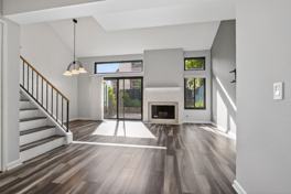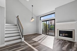 This 2 bedroom/2.5 bathroom townhouse features a bright, modern interior with thoughtful design details throughout. The living room welcomes you with wood-look vinyl flooring, and striking vaulted ceilings with an elegant hanging light fixture. You can find a half bathroom for visits as well and sliding glass doors open to a private patio surrounded by greenery—perfect for indoor-outdoor living.