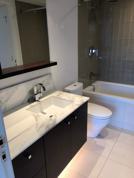 This contemporary 1-bed & flex unit comes with A/C & features an open layout with the kitchen overlooking the living and dining area. against the backdrop of downtown Vancouver, visible through the floor-to-ceiling windows. The kitchen comes with Miele appliances, spacious marble countertops & a large kitchen island perfect for entertaining friends and family. En-suite bathroom features radiant floor heating and a large soaker tub.