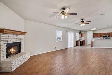ceiling fans, and a cozy fireplace in the living room. The master suite offers serenity after a long day in a soaking tub,