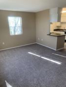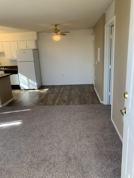 Tan living room walls with vinyl from the kitchen into the dining room. Corner unit so you get a kitchen window and an additional living room window as well.