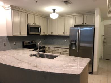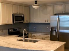 -Remodeled Modern Kitchen with granite countertops, stainless steel appliances, and a convenient breakfast bar