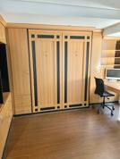 This cozy bright south-facing studio has an efficient layout, and is furnished with a set of solid wood double-size wall bed, office desk, and closets; the living area is equipped with a loveseat and a coffee table. It also has a large den that's turned into a walk-in closet. Laundry in suite, portable AC is provided. Studio is close to 500 sqft. so it has plenty of storage space.
