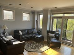 Sunny and spacious upgraded penthouse apartment with high ceilings in great location between Lincoln Park and Lakeview. Private patio with grill and access to beautiful rooftop deck and building’s gym. Kitchen well equipped with stainless steel appliances and three beautiful skylights (in kitchen and each bathroom). Central heat and A/C, fireplace, real hardwood floors, dishwasher and washer-dryer all in-unit, master bath with jacuzzi. Quiet building that is secure with fob entry.