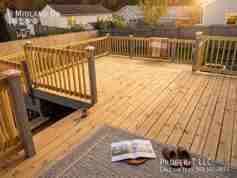 -Spacious Kitchen: Features ample cabinet space, granite countertops, black stainless steel appliances (refrigerator, electric range, dishwasher, built-in microwave), and a pantry. French doors lead to a recently updated two-tier deck overlooking the large, fenced backyard.