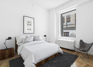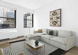 Consequent to a considerable elevator ride, you walk down the hall into this recently renovated unit. Immediately you are hit with sunlight from NINE points of exposure, bringing together the earthy tones of the longboard mahogany floor boards, the acoustics of the sky-hight ceiling, and the gorgeous views of the east Manhattan skyline. As you look to your left, you will see a beautiful open kitchen, fitted with top grade stainless steel appliances (including a microwave and dishwasher), beautiful polished black marble countertops, walnut cabinetry both above and below the counters, as well as an Austrian crystal chandelier, adding the finishing touch of a refined luxurious feel. As you walk forwards you will pass two fully built in, pre-organized wardrobe closets en route to the bathroom. There you will find a custom vanity Crme de Marfil stone counters and tiling, an arching stainless steel vessel sink, and a Kohler beveled frameless medicine cabinet. **this unit is a FLEX-1