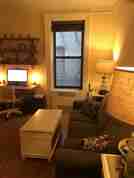 The building is a converted historic midtown hotel with a legendary speakeasy in the basement. The building was recently renovated and has a 24 hour doorman, and is immediately accessible to every major subway line. Central Park is a 4 minute walk away from the front door and all the fun restaurants of Hell's Kitchen are 5 minutes to the west. The apartment itself can come furnished as shown in the pictures (including all required living furniture, lamps, TVs, etc.) or can be empty upon your arrival.