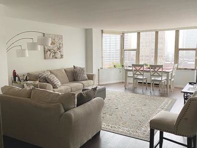 Prime 2 bedroom condo with brand new hardwood floors through-out, open kitchen with stainless steel appliances, updated bathroom, tons of natual light with amazing city and lake views! Master bedroom has walk-in closet plus additional closet. Included fully furnished with brand new furniture. walk to the lake, entertainment, restaurants, shopping, and bus to the Loop! Full amenity high-rise include 24-hour door staff, swimming pool, huge sun deck with gazebos and grills, fitness room, laundry room, cleaners and on-site management, plus storage cage on same floor as condo. Attached garage spots available for rent or easy street parking.