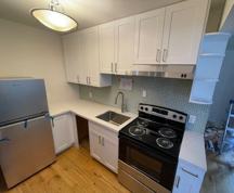 New Remodeled Kitchen with new quartz countertop, new white stylish cabinets, new stainless-steel appliances including refrigerator, electric range, range hood, dishwasher *not pictured, will be installed once apartment is vacant