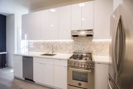 -High-end kitchen with quartz countertops, white glossy cabinets, and mosaic tile backsplash