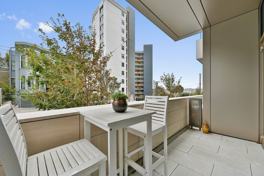 The interior furnishing design choices combine subtle variations of off white and pale grey, with the cotton velvet sectional as the centerpiece of the seating. Cafe table & chairs are provided on the terrace.