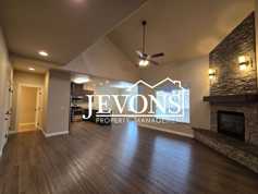 - Living Area: Well-illuminated spaces, living room with fireplace and ceiling fan, and high ceilings
