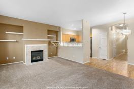 -Spacious living area with plush carpeting, built-in shelving, and a cozy gas fireplace