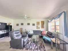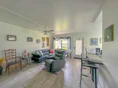 Annual rental in a 55+ community: Fully remodeled first-floor corner 2-bedroom, 2-bath unit in Century Village Boca Raton featuring neutral porcelain tile throughout, a modern white shaker kitchen with granite countertops and stainless steel appliances, updated bathrooms including a master bath with a step-in shower (no tub), and a light, bright screened-in patio with Southern exposure for natural light and breezes.