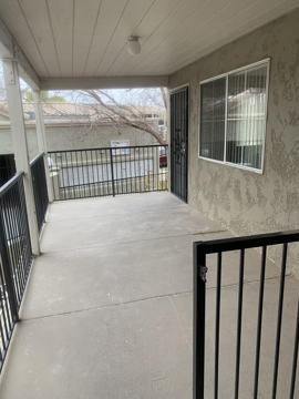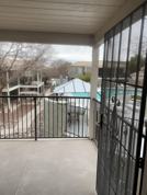 Upstairs Brentwood with fully gated patio area facing the pool, exercise room, and the leasing office.
