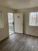 Full-size washer and gas dryer located in the dining room area with bi-fold doors to hide the appliances. Ceiling fans located in the dining room and master bedroom area. Grey vinyl flooring throughout the apartment home with brand new carpet and pad in the bedrooms.
