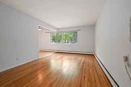 This unit has hardwood floors, a large living room with built-in air conditioner, a dining area, and a galley style kitchen. Bedrooms are generously sized.