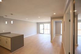 Contemporary, third floor 1BR/1BA in a building on Wayne Place between 3rd Avenue and Athol in Cleveland Heights. Floors are hardwood except in bath. Open living room has a deck with sliding glass doors at one end, kitchen at the opposite side. Kitchen includes an electric stove, microwave, dishwasher, and provides bar-style seating for three on the living room side. Bedroom has two wall closets with sliding mirror doors face-to-face in the access to the bath. Bath has shower-over-tub.