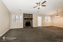 Inside, the living room features taller ceilings, carpeted flooring, and a mantle with stone detailing that adds character to the main gathering space. Just off the living room, a breakfast nook provides a bright dining area and includes a door leading outside.