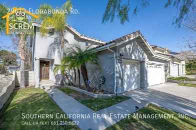 This beautiful three-bedroom home in Canyon Country features hardwood flooring in the entryway and an oak front door with beveled glass. Upon entering, you'll find a formal living room that connects to the family room via a two-way fireplace. The formal dining room opens to the living room, creating an inviting flow. The kitchen boasts tile countertops and hardwood flooring, with a dining area that has a sliding glass door leading to a nicely landscaped, private backyard featuring a covered patio. Kitchen appliances include a stove, dishwasher, microwave, and refrigerator. The family room features the two-way fireplace with a tile border. There is also a half bathroom conveniently located downstairs. Upstairs, you will find two guest bedrooms and a full guest bathroom. The primary bedroom is designed for comfort, featuring wainscoting, vaulted ceilings, laminate flooring, a ceiling fan, and two closets with mirrored doors. The attached full primary bathroom includes double sinks and a walk-in shower. Additional features include a three car garage and a laundry room with washer and dryer hookups. This home is conveniently located near a shopping center and the 14 freeway. *Owner may consider a dog, no cats.