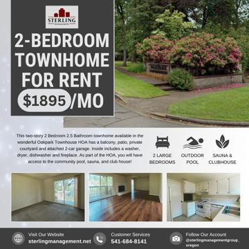 This two-story 2 Bedroom 2.5 Bathroom townhome available in the wonderful Oakpark Townhouse HOA has a balcony, patio, private courtyard and attached 2-car garage. Inside includes a washer, dryer, dishwasher and fireplace. As part of the HOA, you will have access to the community pool during the summer!