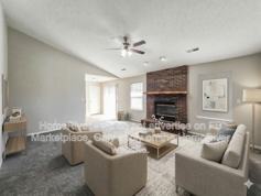 Welcome to this charming 3 bedroom, 2 bathroom ranch-style home. Spanning 1,200 square feet, this residence offers a thoughtfully designed split-bedroom floor plan that maximizes both privacy and shared living space. As you step inside, you are greeted by an expansive living room characterized by its impressive vaulted ceilings and a classic floor-to-ceiling brick fireplace, creating a warm and inviting focal point for the home. Large windows throughout the main living areas allow for an abundance of natural light, highlighting the fresh neutral paint. The heart of the home is the eat-in kitchen, which features sleek white cabinetry, a convenient pantry, and modern stainless steel appliances including a built-in microwave and dishwasher. Adjacent to the kitchen, the breakfast nook provides a perfect spot for morning coffee with views of the outdoors. The primary suite serves as a true retreat, boasting a spacious walk-in closet and a private ensuite bathroom. Two additional well-proportioned bedrooms and a second full bath offer plenty of flexibility for guests, a home office, or hobbies. Outdoor living is a breeze with a sliding glass door that leads from the living area to a generous rear patio and a sprawling backyard. This private outdoor oasis is perfect for weekend gatherings or quiet relaxation. Additional features include a dedicated laundry room and an attached two-car garage for convenient parking and storage. Situated in a tranquil neighborhood with easy access to local shopping, dining, and parks, this move-in-ready home is the perfect blend of style and function. Disclosure: Some images have been virtually staged to better showcase the true potential of rooms and spaces in the home.