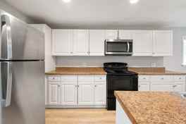 Step inside to find a warm and inviting interior, featuring rich wood flooring that complements the home's natural setting. The heart of the home boasts stainless steel appliances and ample cabinet space.