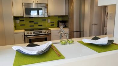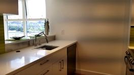 The suite has gorgeous hardwood floors throughout. The den/flex space has a glass top desk with plenty of shelving and drawers for storage. The bedroom has a comfortable queen-sized bed, custom closet built-ins, and if the glass doors are open, stunning views to False Creek and David Lam Park. The kitchen has top of the line stainless steel appliances including new fridge, glass cooktop stove/oven, microwave, Nespresso coffee machine and dishwasher. The spa-inspired bathroom that has a deep soaker tub. Spacious pantry room and full-sized stacked washer and dryer. Sorry, no balcony & absolutely no smoking of any type permitted.