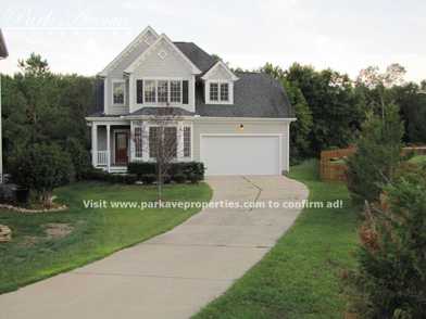 This beautiful home in Heritage Wake Forest is like new! Features include hardwood floors, crown molding, and a dining room accented by a bay window and beadboard wainscoting. The adjacent kitchen with a pantry and maple cabinets has a breakfast bar that overlooks the family room with a fireplace and TV niche. The master suite is conveniently located downstairs, complete with soaring cathedral ceilings, a walk-in closet, and a bath with a dual sink vanity and a separate tub with a tile surround. A deck overlooks the back yard, which backs to a wooded buffer and a creek for added privacy. Pets conditional, including $500 pet deposit that covers up to 2 pets.
