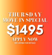 Move-In Ready on 05/14/2026! THURSDAY MOVE-IN SPECIAL! $1495 MOVE-IN, if moved in on or before 05/21/2026 (latest possible move-in date)! Move-In special includes the refundable security deposit, admin fee and ONE WEEK FREE RENT! $85 paid per month towards refundable security! Prorated rent is due one week after move-in! 1st full month of rent is due on JUNE 1ST! (Animal fees are not included in this move-in special and are due at move-in if applicable)