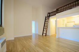 >>The apartment opens on large entrance gallery lined with wall closet space, the corridor running under the lofted bridge leads to the 16 feet high ceilings living quarters.
