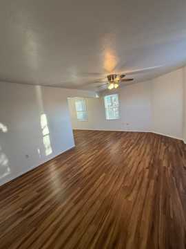 The living room/dining/kitchen areas have wood laminate. Both bedrooms have new carpeting, and all windows have new blinds. All freshly repainted and bathroom sinks/vanity & toilet all new.