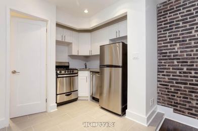 The apartment features a separate but open chef's kitchen with stainless steel GE appliances including dishwasher and microwave, caesarstone Quartz countertops, custom cabinetry, and light grey slate flooring; a sunken, windowed living room with plenty of space; Queen-size, windowed bedroom with generous double closet; brand new marble bathroom with bathtub; exposed brick and recessed lighting throughout; brand new, espresso stained, oak plank flooring; high ceilings.