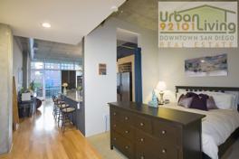 Check out this fantastic loft unit at Fahrenheit in Downtown San Diego's East Village neighborhood. Unit #312 is a 760 square foot condo rental with exposed concrete throughout, giving it a very industrial look. This unit features a very spacious, outdoor balcony, which adds extra square footage for entertaining and/or relaxing.