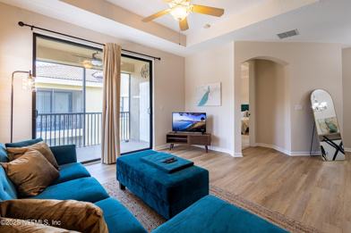 Welcome to the nicest and fully FURNISHED condo in the gated Avila community of exclusive Palencia! This quiet end unit home has three bedrooms, two bathrooms and is impeccably and comfortably furnished with new touches including: Mohawk vinyl floors in main living area, carpet in bedrooms, paint, microwave, dishwasher, hot water heater, in-unit washer/dryer, spa shower heads, and granite kitchen countertops. The home also has a brightly lit kitchen with lots of storage space, and a screened-in porch. The bedrooms are generously-sized and feel more like a house than a condo. Two are furnished. The primary has a king-sized bed, a second bedroom has a queen, and a third unfurnished bedroom can be used as a bedroom, office, or storage. You're steps away from a beautiful pool, Publix shopping center, and full access to all of the fabulous Palencia amenities. Don't miss this move in ready home! TWO OPTIONS: 12 month lease for $1800/mo. or 7 month lease for $2,200/mo.