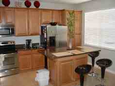 The interior features a gourmet kitchen with granite countertops, stainless steel appliances, and 42-inch cabinets offering ample storage.