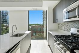 From the keyless entry down to the light fixtures, these apartments are thoroughly modern. Fans of the contemporary design will love the exposed concrete surfaces paired with floor-to-ceiling windows and sustainable laminate wood flooring. Spacious, European-style kitchens come with quartz countertops and stainless appliances, while bathrooms are equally stylish with Grohe fixtures. Each unit has a washer and dryer.