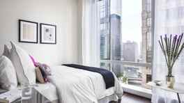 The apartment homes in this exquisite building are nothing short of impressive, offering white marble counters, duotone cabinets and mosaic backsplashes in the kitchens. All living room and bedroom spaces are appointed with plank-style hardwood flooring, while spa-like bathrooms offer polished, natural stone floors. Each apartment boasts floor-to-ceiling windows, full-size washers and dryers, and fully controlled resident thermostat. The residences are beautiful and functional.