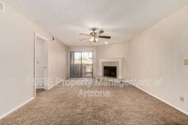 Welcome to this stunning end-unit condo at Center Court, offering prime location and a sparkling view of the community pool. Step inside to find a warm, inviting interior with a neutral palette, plush carpeting in key areas, and a cozy fireplace. Sliding doors lead to a private balcony, perfect for unwinding. The kitchen boasts wood-look flooring, shaker cabinets, and a breakfast bar, while the dining nook shines beneath a charming chandelier. The spacious primary suite features a walk-in closet and dual-sink bathroom. Enjoy resort-style amenities plus nearby shopping, hospitals, and dining. This rare find won’t last!