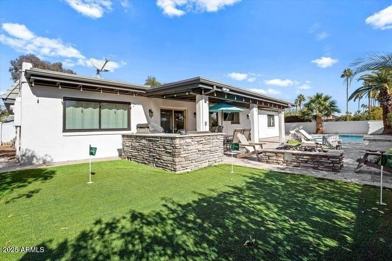 This beautiful Scottsdale AZ home is located in the Magic zip code of 85254 in custom home neighborhood! The amazing backyard is a Sanctuary that you can enjoy in any season, with its covered patio, fiesta lights, serving window with bar, built-in BBQ, built-in beverage cooler and fire pit, fragrant citrus trees, sparkling blue pool & a 4 hole putting green! There is separate pool access from one of the 3 bathrooms to serve as Pool Bathroom. There are dual living rooms for extra seating along with a fireplace. Kitchen, Laundry & Bathroom are remodeled. The home also has an attached 2 car Garage with tons of storage space. Fully-Furnished & loaded kitchen, with high-end to mid range furniture (RH, Mitchell Gold Bob Williams, Crate & Barrel, Living Spaces).