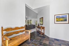 Gorgeous slate floors extend from the kitchen and foyer to the bedroom wing, including a spacious master suite with its 12 ft high ceiling, master bath dual sink vanity, glass enclosed shower, separate soaking tub and large walk-in closet. A door leads from the MBR suite to the deck that extends from the Great Room with just a few steps down to the tranquil yard and lawn. Two comfortable sized bedrooms complete the floor plan along with a dual sink bathroom with tub/shower and a guest powder room. A large, fully equipped laundry is also conveniently located.