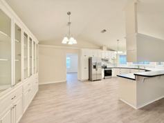 The large, open living area boasts a beautiful stone fireplace and built-in entertainment center with shelving. The kitchen offers abundant cabinet and counter space and a hop-up breakfast bar for easy meal prep & casual dining. Stainless steel appliances include a French door refrigerator, flat top range/oven, and dishwasher. A dual basin sink looks out through a large window and a cozy eat-in area provides a beautiful built-in china cabinet.