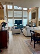 The primary bedroom is located downstairs with glass doors leading to a covered patio, a separate shower, and a walk-in closet. The kitchen offers ample counter space, abundant cabinetry, a cozy breakfast nook, and bar seating. Additional living spaces include a formal dining room and a great room with a full wall of windows and built-ins.