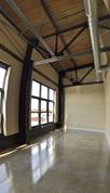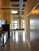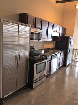 Full size washer and dryer, all stainless steel appliances, and granite counters make this apartment feel modern, while the exposed steel and wooden beams that make up the vaulted ceiling provide a rustic and almost industrial appeal.
