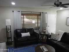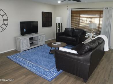 Available March 2026. King bed in the primary. Fully furnished rental home including dishes, linens and furniture. New tile shower, new tile floor, and faucets, new sinks, Sparkly White Quartz counters, new tile herringbone backsplash, new lighting inside and outside. new interior doors and hardware. New 50 inch LG TV in the living room. New paver patio in front and covered patio in back overlooking greenbelt and citrus trees. Flooring is wood look tile throughout and carpet in the bedrooms. AC new 2022, Bedrooms have King and Queen beds. Living room has leather sofa, loveseat and brand new swivel rocker. Sun City is the original Sun City with 7 Rec Centers and 8 golf courses. Attached garage is 1.5 spaces wide. First floor, no stairs, slider to grassy backyard and covered patio.