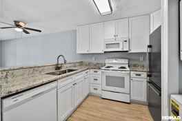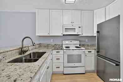 - Modern kitchen equipped with a refrigerator, electric range, dishwasher, microwave, and garbage disposal