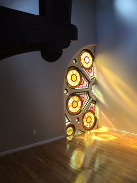 Large apartment on 3 floors in a renovated stone church. Unique, one of a kind apace. High ceilings, stained glass windows, beautiful woodwork. Parking available.