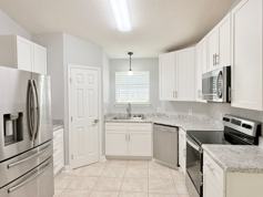 The newly renovated kitchen is both stylish and functional, showcasing white cabinetry, a deep single-basin sink, and stainless steel appliances including a French door refrigerator with bottom freezer drawer, flat-top range/oven, built-in microwave, and dishwasher.