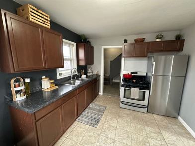 Spacious house with 3 large bedrooms, 1 is the entire 1/2 story. Fridge and stove included. Driveway, small shed, and large back yard. No basement to heat.