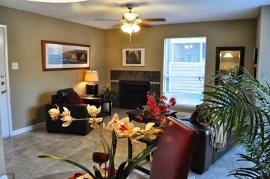 Lovely apartment that overlooks pool with tile through out all living spaces and bedrooms. Kitchen is open to living area. Updated light fixtures and tile surround on fireplace. Come see today!